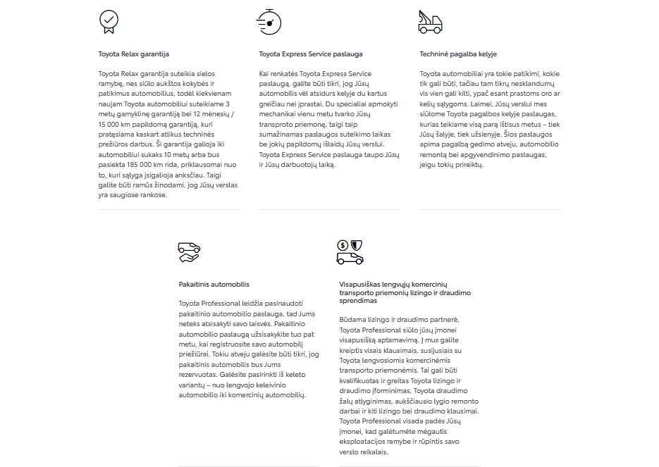 Nesvarbu, ko ieškotumėte – pakaitinio automobilio, skubių paslaugų ar pagalbos kelyje – Toyota Professional yra puikus verslo partneris. Mūsų platus teikiamų paslaugų asortimentas patenkins visus Jūsų verslo poreikius.